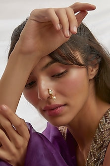 Featuring a gold finish nath studded with kundan polki, set in copper.