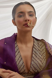Featuring a gold finish nath studded with white kundan polki, set in copper.