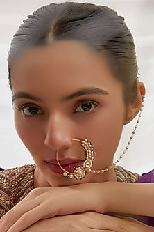 Featuring a gold finish nath studded with white kundan polki, set in copper.