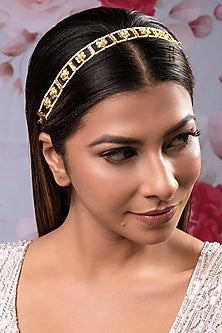 Featuring a gold finish mathapatti studded with kundan polki, set in brass. Perfect choice for weddings, haldi, mehendi and Indian festivities.