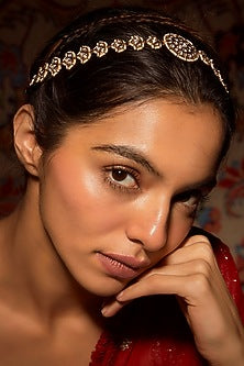Featuring a gold finish mathapatti studded with white kundan polki, set in mixed metal.