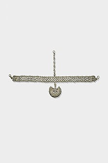 Featuring a gold finish mathapatti studded with kundan polki, set in mixed metal.