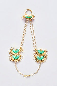 The Gold Finish Silk Thread Embroidered Hand Harness is a stunning piece of jewelry that will add a touch of elegance and sophistication to any outfit. Made from high-quality silk thread, this hand harness features intricate embroidery in a beautiful gold finish. It is a perfect accessory for weddings, parties, or any special occasion. The unique design of this hand harness includes a wrist cuff and a ring connected by a delicate chain. The wrist cuff is adjustable to fit most hand sizes, making it a versatile piece for anyone to wear. The ring also has an adjustable band, ensuring a comfortable fit for any finger. This hand harness is handcrafted by skilled artisans, giving it a one-of-a-kind look. The gold finish and intricate embroidery make it a statement piece that will surely catch the eye of others. It is lightweight and comfortable to wear, making it perfect for a night out or a day-time event. Material: Silk Thread Color: Gold Dimensions: Wrist Cuff - adjustable