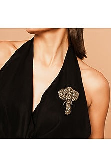Featuring a gunmetal handcrafted elephant brooch with glass beads, nylon thread and suede backing, set in brass. Perfect choice for festive celebrations, wedding or sangeet ceremonies.