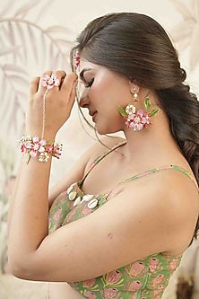 Gold Finish Pink Gemstone & Resin Floral Hathphool (Set of 2)