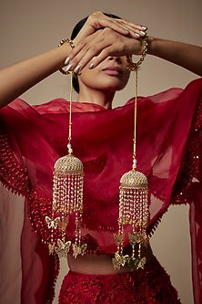 Add a touch of elegance and tradition to your wedding ensemble with our Gold Finish Beaded & Butterfly Charm Tying Kaleeras (Set Of 2). These stunning kaleeras are the perfect addition to any bridal attire, and are sure to make a statement on your special day. Each set includes two kaleeras, made with high-quality materials and finished with a beautiful gold coating. The intricate beaded design adds a touch of sparkle, while the delicate butterfly charm adds a whimsical touch. These kaleeras are the perfect blend of traditional and modern, making them a must-have for any bride. Not only are these kaleeras beautiful, but they also hold special significance in Indian weddings. It is believed that the sound of the kaleeras brushing against each other brings good luck and happiness to the newlyweds. These kaleeras are meant to be tied to the bangles of the bride, symbolizing the start of a new life and the union of two families. These Gold Finish Beaded & Butterfly Charm Tying Kaleeras (Set Of 2) are perfect for any wedding ceremony, whether it be a traditional Indian wedding or a modern fusion celebration. They also make a great keepsake for brides to cherish and pass down for generations to come. Add the finishing touch to your bridal look with our Gold Finish Beaded & Butterfly Charm Tying Kaleeras (Set Of 2). Order yours today and make your wedding day even more special!