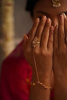 Elevate your accessory game with our exquisite Gold Finish Hathphool , meticulously crafted in high-quality sterling silver. This stunning piece of jewelry combines traditional elegance with contemporary flair, making it a must-have addition to your collection. The hathphool, or hand ornament, is designed to adorn your hand delicately, enhancing your grace and femininity. Its intricate detailing and beautiful gold finish reflect a timeless charm, making it perfect for special occasions or daily wear. Each hathphool is handcrafted by skilled artisans, ensuring that every detail is perfect. The use of sterling silver provides durability while maintaining a lightweight feel, allowing you to wear it comfortably throughout the day. The golden finish offers a luxurious touch, making it an eye-catching accessory that complements any outfit. Whether you're dressing up for a wedding, a festive celebration, or simply want to add a touch of elegance to your everyday look, this Gold Finish Hathphool is the ideal choice. Pair it with traditional attire or modern outfits for a unique look that expresses your individual style. Embrace the beauty of handcrafted jewelry and make a statement with our Gold Finish Hathphool in Sterling Silver. It's more than just an accessory; it's a reflection of your style and grace.