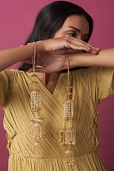 Elevate your traditional attire with our stunning Gold Finish Kaleeras With Faux Pearls . These exquisite accessories are the perfect blend of elegance and sophistication, designed to enhance your bridal or festive look. Each kaleera is crafted with meticulous attention to detail, featuring a luxurious gold finish that catches the light beautifully. Adorned with delicate faux pearls, these kaleeras add a touch of timeless charm and grace to any outfit. The intricate craftsmanship and shimmering embellishments make them a standout addition to your jewelry collection. Whether you're preparing for your wedding day or attending a special occasion, these kaleeras are sure to turn heads. They dangle gracefully, creating an enchanting movement that adds an element of whimsy to your ensemble. Pair them with traditional lehengas, sarees, or modern fusion wear for a captivating look. Lightweight and comfortable to wear, our Gold Finish Kaleeras allow you to celebrate in style without compromising on comfort. Make a statement that reflects your unique personality and love for fashion with these stunning accessories. Embrace the beauty of tradition with a contemporary twist. Add the Gold Finish Kaleeras With Faux Pearls to your collection today and shine at your next event!