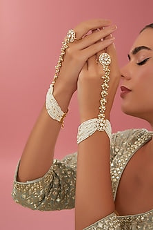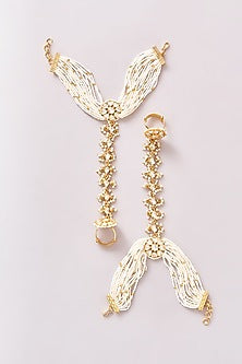Gold Finish Kundan Polki & Pearl Hathphools (Set Of 2)