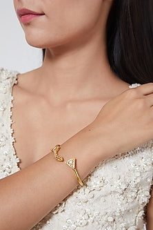 Add a touch of elegance and glamour to your outfit with our Gold Finish Kundan Polki Cuff In Sterling Silver. This stunning piece features intricate kundan and polki work, handcrafted by skilled artisans in India. The cuff is made of high-quality sterling silver, ensuring durability and long-lasting shine. The gold finish adds a luxurious touch to the piece, making it perfect for special occasions such as weddings, parties, or even as a statement piece for everyday wear. The kundan and polki stones are carefully selected and set in a traditional, yet modern design, creating a beautiful contrast against the gold finish. The cuff is adjustable, making it suitable for a variety of wrist sizes. This Gold Finish Kundan Polki Cuff is not only a stunning accessory, but it also holds cultural and historical significance. The kundan and polki techniques have been used in jewelry making in India for centuries and are a symbol of royalty and opulence. Whether you're looking for a gift for a loved one or want to treat yourself, this Gold Finish Kundan Polki Cuff is the perfect choice. Its timeless design and exquisite craftsmanship make it a must-have for any jewelry collection. Embrace the beauty and tradition of Indian jewelry with our Gold Finish Kundan Polki Cuff In Sterling Silver. Order now and add a touch of luxury to your wardrobe.