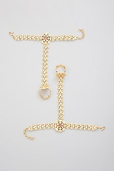 Add a touch of elegance to your traditional outfit with this Gold Finish Kundan Polki Hathphool set. Crafted with intricate details, this set of 2 hand ornaments is perfect for any special occasion. The hathphool is adorned with sparkling kundan and polki stones, giving it a luxurious look. The gold finish adds to its beauty and makes it a must-have for every woman's jewelry collection. Features: Set of 2 hand ornaments Made with high-quality kundan and polki stones Gold finish for a luxurious look Intricate design for a traditional touch Easy to wear and comfortable Perfect for weddings, festivals, and other special occasions Great gift for your loved ones