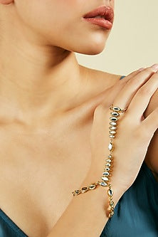 Elevate your accessory game with our exquisite Gold Finish Marquise Mirror Hand Harness . This stunning piece features a contemporary design that seamlessly blends elegance and modernity, making it the perfect addition to any outfit. Crafted with meticulous attention to detail, the hand harness showcases a beautiful marquise-shaped mirror centerpiece that reflects light beautifully, adding a touch of glamour to your look. The gold finish adds a luxurious feel, ensuring you stand out at any event, be it a casual gathering or a formal occasion. Designed for comfort, the adjustable straps fit snugly around your hand, allowing for easy movement while providing a secure fit. Whether you're dressing up for a night out or looking to enhance your everyday ensemble, this hand harness is versatile enough to complement various styles. Perfect for fashion-forward individuals who appreciate unique and statement-making jewelry, the Gold Finish Marquise Mirror Hand Harness is sure to turn heads. Pair it with your favorite dress or a chic top and jeans for a trendy look that speaks volumes about your fashion sense. Indulge in the luxury of this stunning accessory and let your hands do the talking. Add the Gold Finish Marquise Mirror Hand Harness to your jewelry collection today!