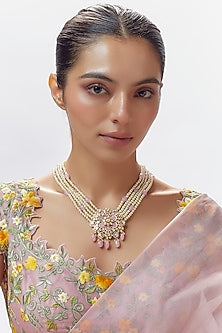 Gold Finish Moissanite Polki & Pink Stone Mala In Sterling Silver