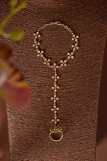 Elevate your jewelry collection with our stunning Gold Finish Moissanite Polki Handharness, meticulously crafted in high-quality sterling silver. This exquisite piece combines the brilliance of moissanite stones with the traditional beauty of Polki design, creating an eye-catching accessory that is perfect for any occasion. The unique gold finish adds a touch of elegance, enhancing the natural sparkle of the moissanite while providing a luxurious look. Each handharness showcases intricate detailing, showcasing the artistry and skill that goes into its creation. The Polki stones are ethically sourced, providing a vintage aesthetic that complements both modern and traditional styles. Designed for comfort and versatility, this handharness can be worn alone or layered with other bracelets for a chic, bohemian look. Whether you're dressing up for a special event or adding a touch of glamour to your everyday outfit, this piece is sure to turn heads and make a statement. Make every moment memorable with the Gold Finish Moissanite Polki Handharness. It's more than just jewelry; it's a piece of art that embodies elegance, sophistication, and timeless beauty.