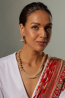 House of Vastraa presents a gold finish temple mala studded with multi-colored stones and kundan polki, set in mixed metal. It is paired with a matching pair of earrings. This mala set is a true testament to the artistry of India's rich cultural heritage, ideal for festive occasions or wedding celebrations.