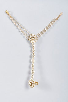 Elevate your traditional attire with our exquisite Gold Finish Pachi Kundan Hathphool . This stunning set of two hand ornaments is designed to add a touch of elegance and sophistication to any outfit, making it a perfect choice for weddings, festivals, or special occasions. Crafted with meticulous attention to detail, the hathphool features intricate Pachi Kundan work, showcasing the artistry of skilled artisans. The luxurious gold finish enhances the beauty of the Kundan stones, reflecting light and creating a dazzling effect that is sure to catch the eye. Each piece in this set is designed to comfortably adorn your hands, with an adjustable chain that ensures a perfect fit for all. Whether you wear them together or separately, these hathphools are bound to make a statement and enhance your overall look. Perfectly combining traditional craftsmanship with contemporary style, our Pachi Kundan Hathphool set is a must-have accessory for every jewelry lover. Make a lasting impression and express your unique sense of style with this beautiful addition to your jewelry collection. Indulge in the timeless charm of gold and Kundan, and embrace the elegance that our Gold Finish Pachi Kundan Hathphool set brings to your ensemble. Order yours today and step out in confidence!