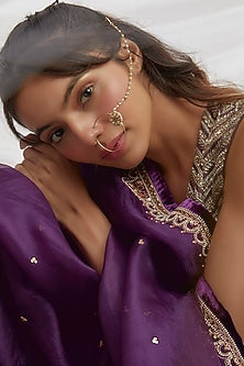 Featuring a gold finish nath studded with red kundan polki, set in copper.
