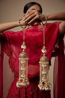 Add a touch of elegance and tradition to your special day with our Gold Finish Shell Charm Tying Kaleeras. These beautiful kaleeras come in a set of two, perfect for the bride and her partner to share. Each kaleera is intricately designed with delicate gold colored shells and charms, adding a unique and stunning look to your wedding attire. Kaleeras are an essential part of Indian wedding traditions, symbolizing prosperity and good luck. Our Gold Finish Shell Charm Tying Kaleeras not only capture the essence of these traditions, but also add a modern twist with the use of trendy shell charms. These kaleeras are perfect for any bride looking to add a contemporary touch to their wedding ensemble. Made with high-quality materials, our Gold Finish Shell Charm Tying Kaleeras are durable and lightweight, ensuring comfort throughout your wedding festivities. The gold finish adds a regal and luxurious feel, making these kaleeras the perfect accessory to complete your bridal look. These kaleeras also make for a wonderful keepsake to cherish for years to come. Whether you choose to wear them on your special day or display them in your home, these kaleeras will serve as a beautiful reminder of your wedding day and the love shared between you and your partner. Complete your wedding attire with our Gold Finish Shell Charm Tying Kaleeras and make a statement on your special day. Embrace tradition with a modern twist and add a touch of glamour to your wedding ensemble. Order yours now and make your wedding day even more magical!