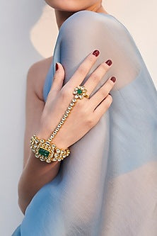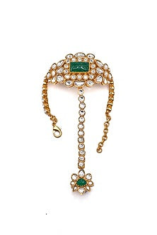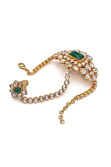 Elevate your style with this exquisite Gold Finish Synthetic Stone Hathphool. This traditional hand accessory is perfect for adding a touch of glamour to any outfit. It features a beautiful combination of gold finish and synthetic stones, making it a versatile piece that can be worn with both traditional and modern attire. Made with high-quality materials for long-lasting durability Features a gold finish for a luxurious look Adorned with synthetic stones for added sparkle and shine Adjustable design to fit comfortably on any hand Lightweight and comfortable to wear for extended periods of time Perfect for weddings, parties, and special occasions Whether you're attending a wedding, a festive event, or just want to elevate your everyday look, this Gold Finish Synthetic Stone Hathphool is the perfect accessory. It also makes for a thoughtful gift for your loved ones on birthdays, anniversaries, or any other special occasion. Experience the beauty and elegance of this Gold Finish Synthetic Stone Hathphool. Add it to your collection today and make a statement with your style.