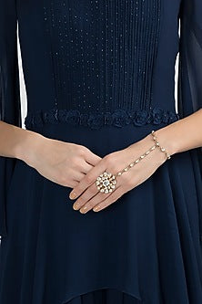 Add a touch of elegance and tradition to your attire with our Gold Plated Kundan Hath Phool. This beautiful piece of jewelry is handcrafted by skilled artisans using high-quality materials to ensure durability and intricate design. The hath phool, also known as hand bracelet, is an iconic piece of jewelry that has been worn by women for centuries in South Asia. Our Gold Plated Kundan Hath Phool is a modern take on this traditional accessory, perfect for special occasions or even daily wear to add a touch of glamour to your outfit. The hath phool features stunning kundan stones in a gold-plated setting, giving it a luxurious and timeless look. The adjustable chain and clasp ensure a comfortable fit for all sizes. Made with high-quality materials Handcrafted by skilled artisans Features stunning kundan stones Adjustable chain and clasp for a comfortable fit Make a statement and add a touch of traditional elegance to your ensemble with our Gold Pl