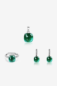 Elevate your jewelry collection with our exquisite Green Stone & Zircon Pendant Set , beautifully crafted in sterling silver. This stunning set features a captivating green stone, known for its unique hues and natural charm, expertly paired with shimmering zircon stones that add a touch of brilliance and elegance. The pendant boasts a contemporary design that seamlessly integrates the vibrant green stone with high-quality zircon accents, making it a perfect accessory for both casual and formal occasions. The lustrous sterling silver setting not only enhances the overall beauty of the piece but also ensures durability and longevity. Perfect for gifting, this pendant set comes beautifully packaged, making it an ideal choice for anniversaries, birthdays, or special celebrations. Whether you're dressing up for a night out or adding a touch of elegance to your everyday wear, this Green Stone & Zircon Pendant Set is sure to make a statement. Embrace sophistication and style with this exquisite piece, and let the enchanting green stone and sparkling zircon illuminate your look. Make it yours today and experience the perfect blend of nature's beauty and artisanal craftsmanship!
