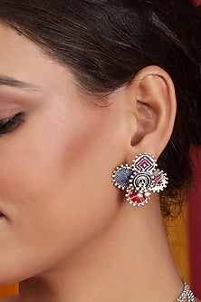 Oxidised Silver Finish Enameled Ear Studs In Sterling Silver