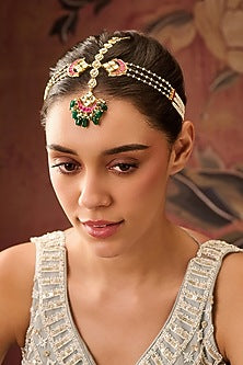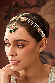 Featuring a 22kt gold plated adjustable mathapatti studded with red kundan polki, pearls and natural jade green stones, set in mixed metal. It has a hook closure. Perfect for weddings, festive celebrations and grand occasions.