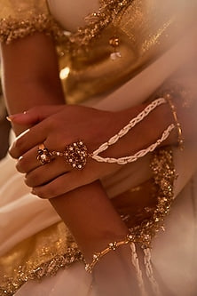 Featuring a pair of antique gold finish lotus hathphool, set in brass. Perfect for weddings or special occasions, this piece not only adds elegance but also carries a timeless appeal, making it a cherished part of any bridal ensemble.
