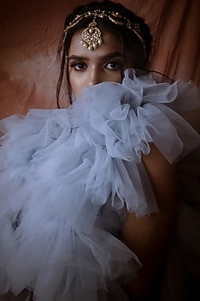 Featuring a 22 Kt gold plated moon shaped matha patti studded with white jadtar, semi precious stones, pearls and glass beads, set in silver and copper.