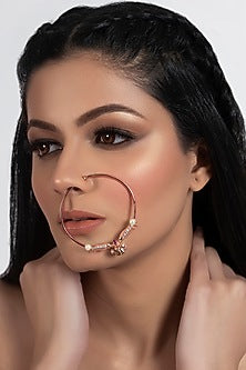 Featuring a 22 Kt rose gold plated engraved nath studded with swarovski crystal and zirconia, set in mixed metal.