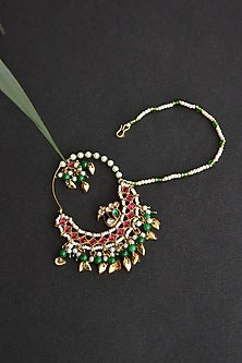 Featuring a gold finish handcrafted nose ring studded with kundan polki and pearls, set in brass.