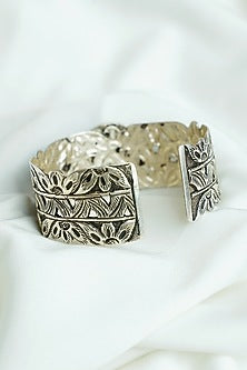 Featuring a silver finish openable chittai cuff studded with halo stones and emerald green gemstone, set in 92.5 sterling silver. Perfect for a festive wear, cultural events or gifting.