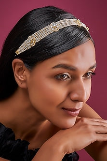 Featuring a gold finish maatha patti studded with white imitation kundan, set in brass.