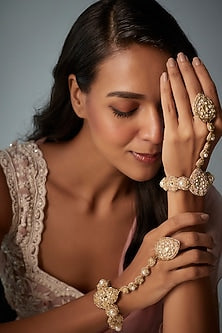 Aari & Zardosi Hand Embroidered Hand Harness (Set Of 2) Add a touch of traditional elegance to your look with our Aari & Zardosi Hand Embroidered Hand Harness. Each set comes with two hand harnesses, each intricately hand embroidered with Aari and Zardosi techniques. These techniques have been used for centuries to create stunning and detailed designs on fabric, and now you can wear them on your hands. Set of 2 hand harnesses Hand embroidered with Aari and Zardosi techniques Adjustable chain for a comfortable fit Available in multiple colors Adds a touch of traditional elegance to any outfit Perfect for special occasions or