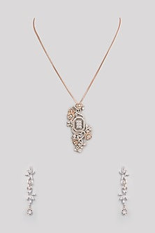Create a stunning and elegant look with our Rose Gold Finish Zircon Pendant Set In Sterling Silver. This gorgeous set includes a pendant and matching earrings, perfect for any special occasion or everyday wear. The pendant and earrings are made of high-quality sterling silver, giving them a luxurious and durable finish. The rose gold plating adds a touch of warmth and glamour, making this set a must-have for any jewelry collection. The centerpiece of the set is a beautiful zircon stone, expertly cut and faceted to reflect light and sparkle from every angle. The zircon stone is known for its brilliance and durability, making it a popular choice for fine jewelry. Our pendant set is designed to complement any outfit, whether you're dressing up for a formal event or adding a touch of elegance to your everyday look. The set can be worn together for a coordinated look or separately to mix and match with other jewelry pieces. Each piece in the set is carefully crafted and inspected to ensure top quality and a flawless finish. The attention to detail and expert craftsmanship make this pendant set a truly special and one-of-a-kind piece. Add a touch of sophistication to your jewelry collection with our Rose Gold Finish Zircon Pendant Set In Sterling Silver. It also makes a thoughtful and timeless gift for a loved one on any occasion.