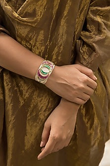 Elevate your jewelry collection with this exquisite 14kt White Gold Cuff , featuring stunning 24kt Natural Rubies and Emerald Polki stones. This handcrafted piece is designed to make a statement, showcasing the beauty of traditional craftsmanship combined with modern elegance. The cuff is set in premium Sterling Silver , ensuring durability and a lasting shine. The lustrous white gold finish enhances the vibrant colors of the rubies and emeralds, making it a perfect accessory for both casual outings and formal events. Each stone is carefully selected for its unique qualities, ensuring that no two cuffs are alike. This Polki cuff embodies the rich heritage of Indian jewelry making, where each piece tells a story of artistry and passion. Its versatile design allows it to be worn alone for a minimalist look or stacked with other bracelets for a bold, layered effect. Ideal for gifting or as a self-indulgence, this cuff is a timeless addition to any jewelry lover's collection. Experience the rich colors and intricate designs that only nature can provide with this stunning piece.
