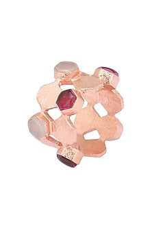 Featuring a rose gold plated folly ring with hydro pink quartz and pink moonstone semi precious stone along with scalloped borders, set in customised metal alloy. We love it because it resembles a tessellated bee hive. Handmade In India.