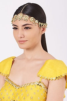 House of Vastraa presents a gold finish mathapatti studded with kundan polki, set in mixed metal.