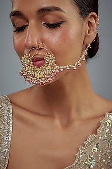 Featuring a gold finish nath studded with kundan polki, set in mixed metal. Perfect wear for festive occasions or wedding ceremonies.