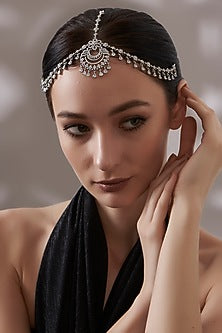 House of Aster presents a white finish mathapatti studded with faux diamonds and zircons, set in mixed metal. Embrace timeless elegance with this exquisite zircon mathapatti.