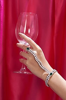 Add a touch of elegance to your accessory collection with our stunning White Finish Zircon & Green Stone Hand Harness. This exquisite piece is designed for the modern woman who appreciates the blend of contemporary style and timeless beauty. Crafted with high-quality materials, the hand harness features a brilliant white finish that complements the sparkling zircon stones, creating a radiant effect that catches the light beautifully. The intricate design showcases the vibrant green stones, adding a pop of color and sophistication to any outfit. Perfect for special occasions or as a statement piece for everyday wear, this hand harness is versatile enough to be paired with both casual and formal attire. Whether you're attending a wedding, a party, or simply out on the town, this accessory will elevate your look and make you stand out. Comfort is key, and our hand harness is designed with adjustable elements to ensure a perfect fit on any hand size. It's not just an accessory; it's a statement of style and individuality. Treat yourself or surprise a loved one with this stunning piece that is sure to become a cherished addition to any jewelry collection. Embrace elegance and sophistication with the White Finish Zircon & Green Stone Hand Harness – where modern design meets timeless beauty.