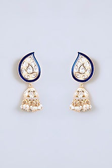 Featuring a gold finish green enameled long necklace studded with kundan polki, set in mixed metal. It is paired with a matching pair of earrings. Perfect for weddings or festive celebrations.